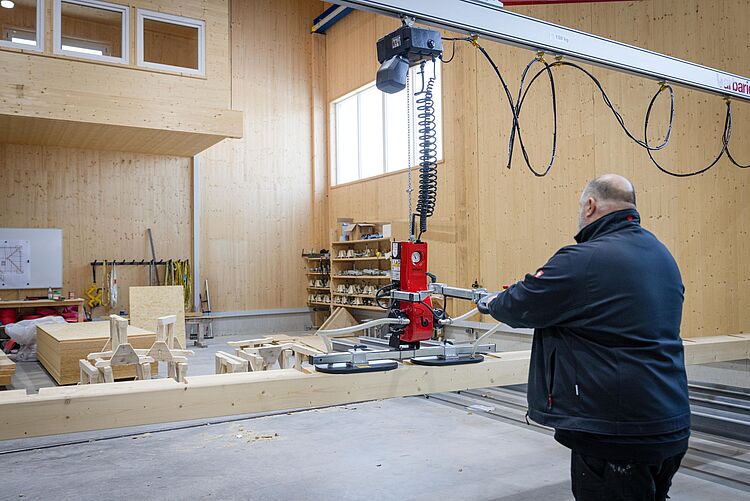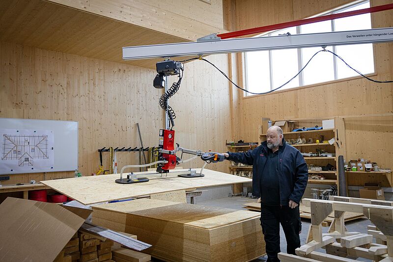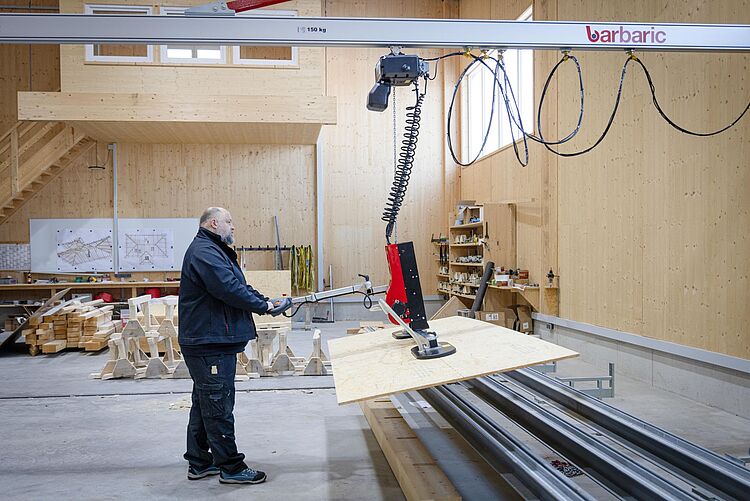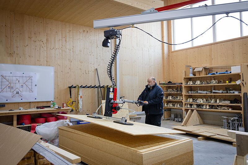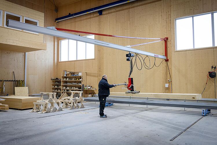 Für den effizienten Bau von Holzwänden und Holzdecken kommt bei diesem Projekt ein UWL 1 in Kombination mit einem Wandschwenkkran mit 10 m Auslegerlänge zum Einsatz. Die Anlage dient dem komfortablen Beschicken eines variablen Tisches und ermöglicht präzises sowie ergonomisches Arbeiten im Fertigungsprozess.
