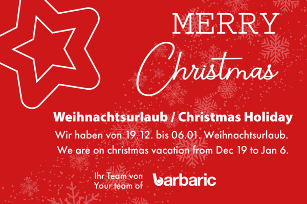 Das gesamte Team von Barbaric wünscht Ihnen und Ihren Familien ein schönes Weihnachtsfest, erholsame Feiertage und alles Gute im neuen Jahr.